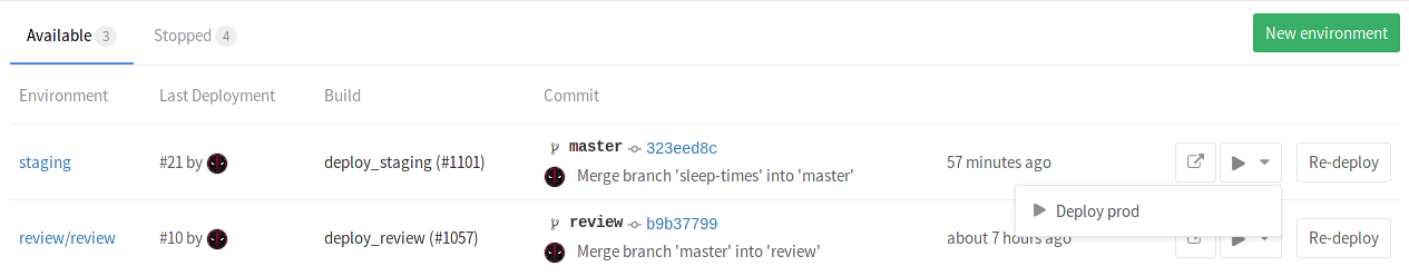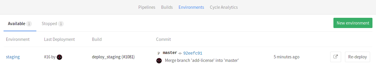 .gitlab-ci.ymlis properly configured will show up in the "Environment" and "Last deployment" lists.